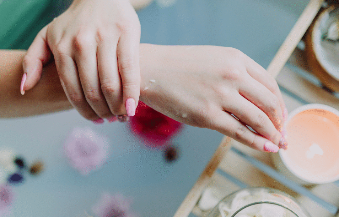 Aplícate aceite corporal mientras respiras profundamente y visualizas bienestar.